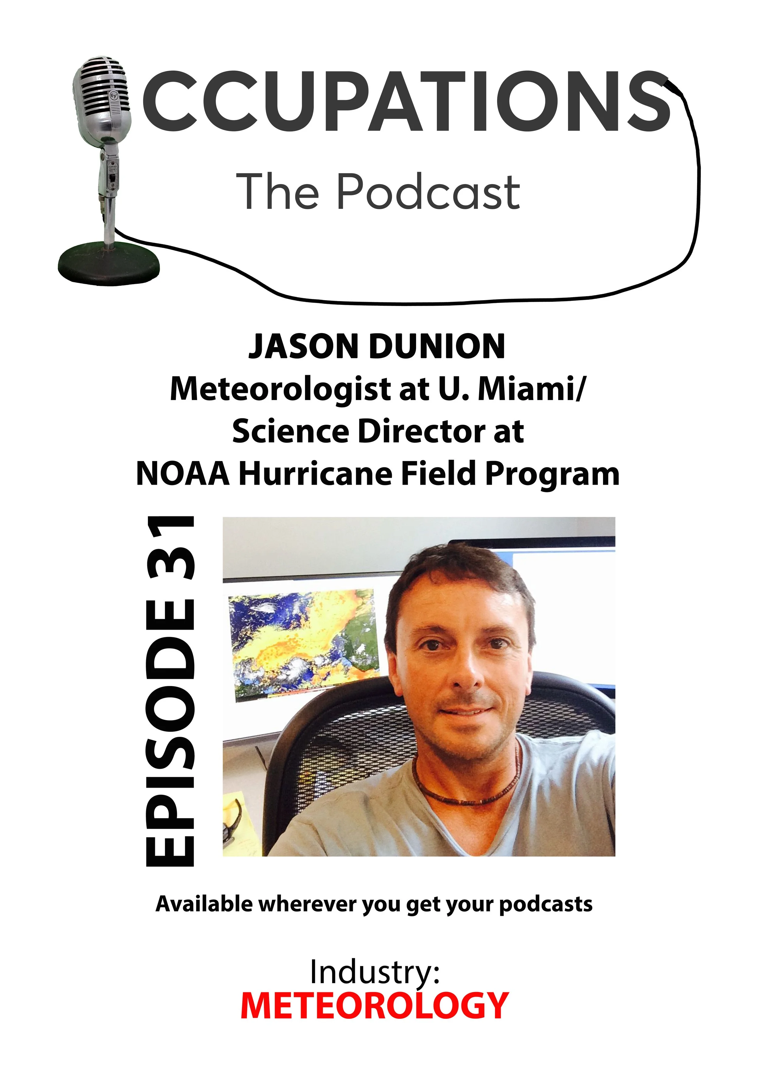 Jason Dunion, Meteorologist at University of Miami/Science Director at NOAA Hurricane Field Program joins me for episode 31 of OCCUPATIONS. He tells us of his multiple missions flying into hurricanes (yes, you read that correctly). He also tells us of his love of meteorology and his path to become part of NOAA and gives advice to those who might want to become part of the science of weather.